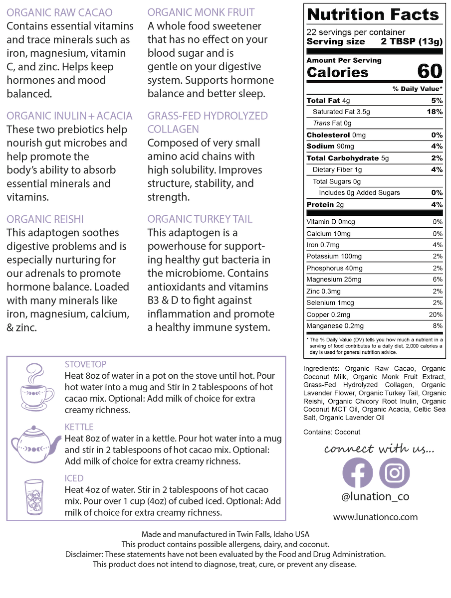 Heat 8oz of water in a kettle. Pour hot water into mug and stir in 3 tablespoons of hot cacao mix. Optional: Add milk of choice for extra creamy richness.