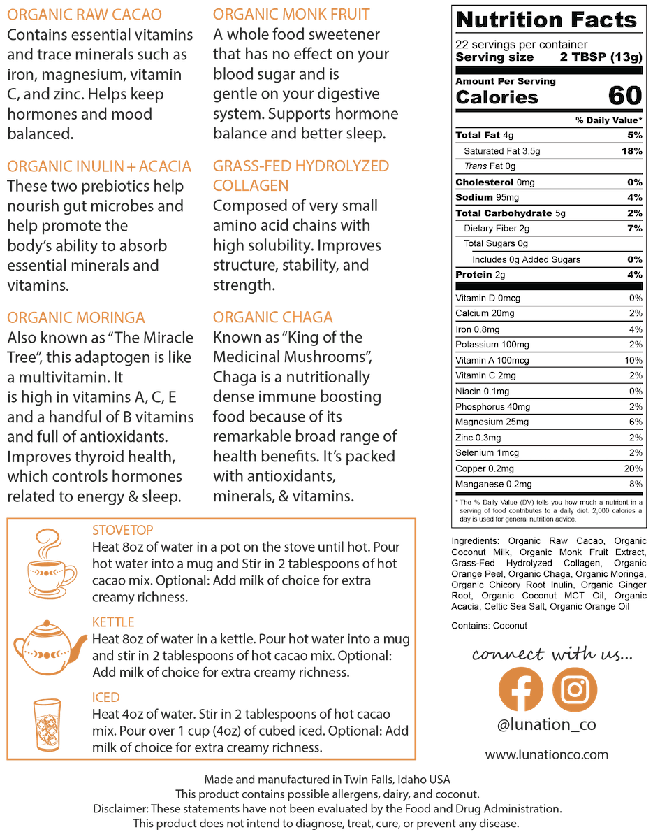 Our Hormone Hot Chocolate mix is made from organic cacao (not to be confused with cocoa). Cacao is pack with essential and trace minerals such as iron, magnesium, phosphorus, and zinc. It also has several vitamins including vitamin A, B vitamins, vitamin C and vitamin E. Our cacao is naturally fermented and pressed before being ground into a powder. In one Tbsp you get about 1 gram of fiber and 240 mg of antioxidants!